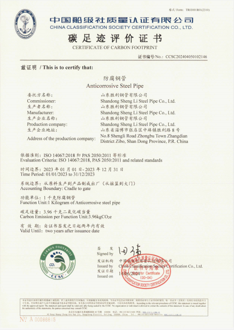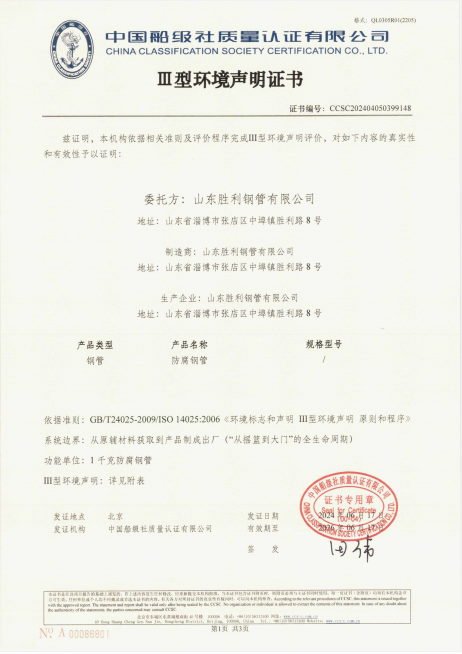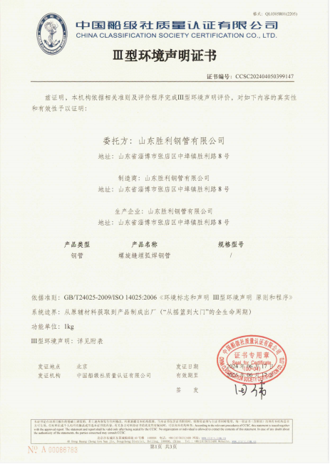 山东胜利顺利通过螺旋缝埋弧焊接钢管和防腐钢管的碳足迹、Ⅲ型环境声明评价认证