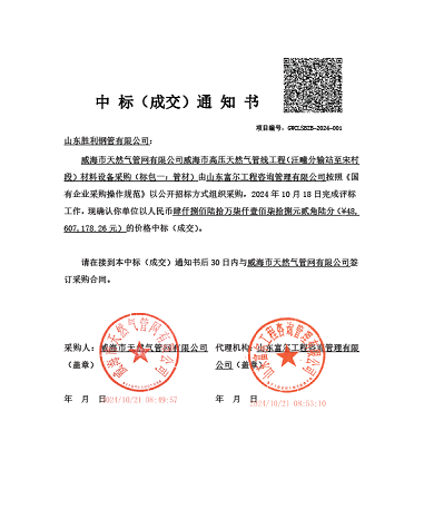 ??近日,山东胜利成功中标了威海市高压天然气管线工程(汪疃分输站至宋村段)材料设备采购的项目,该项目总量8000余吨,标志着公司在市场竞争中再次取得了显著成果,实力得到了市场的广泛认可。