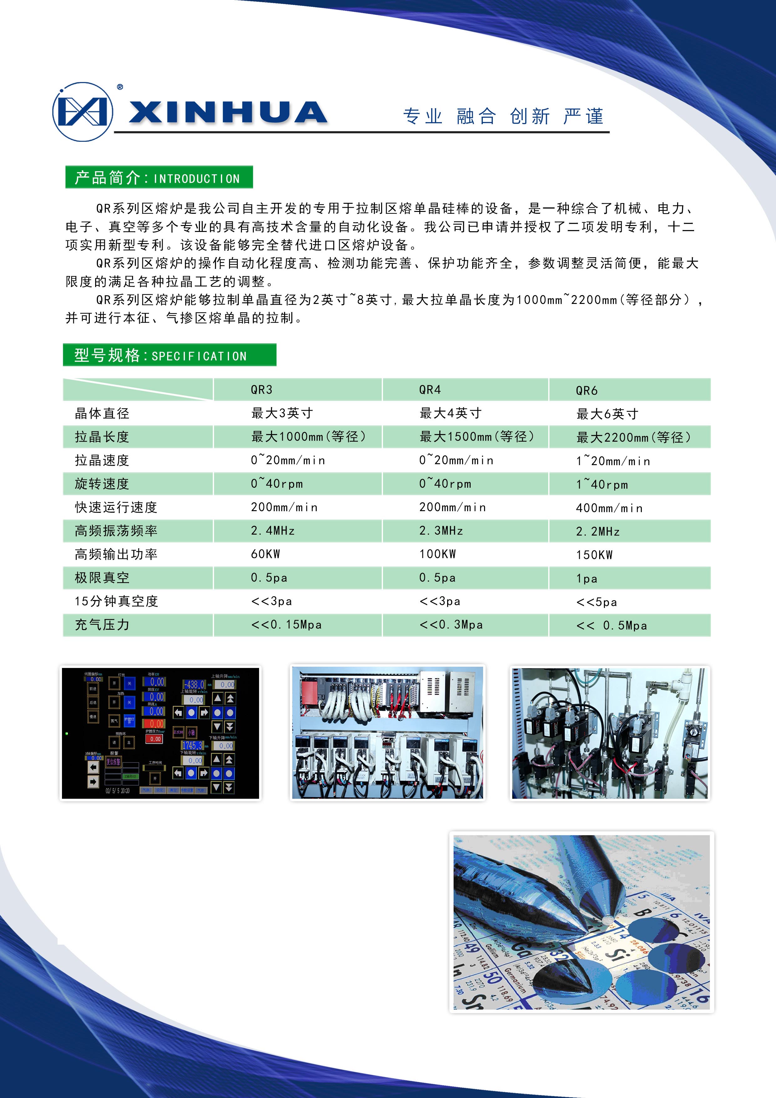 QR系列區(qū)熔爐是我公司自主開發(fā)的專用于拉制區(qū)熔單晶硅棒的設(shè)備,是- -種綜合了機械、電力、電子、真空等多個專業(yè)的具有高技術(shù)含量的自動化設(shè)備。我公司已申請并授權(quán)了二項發(fā)明專利,十二